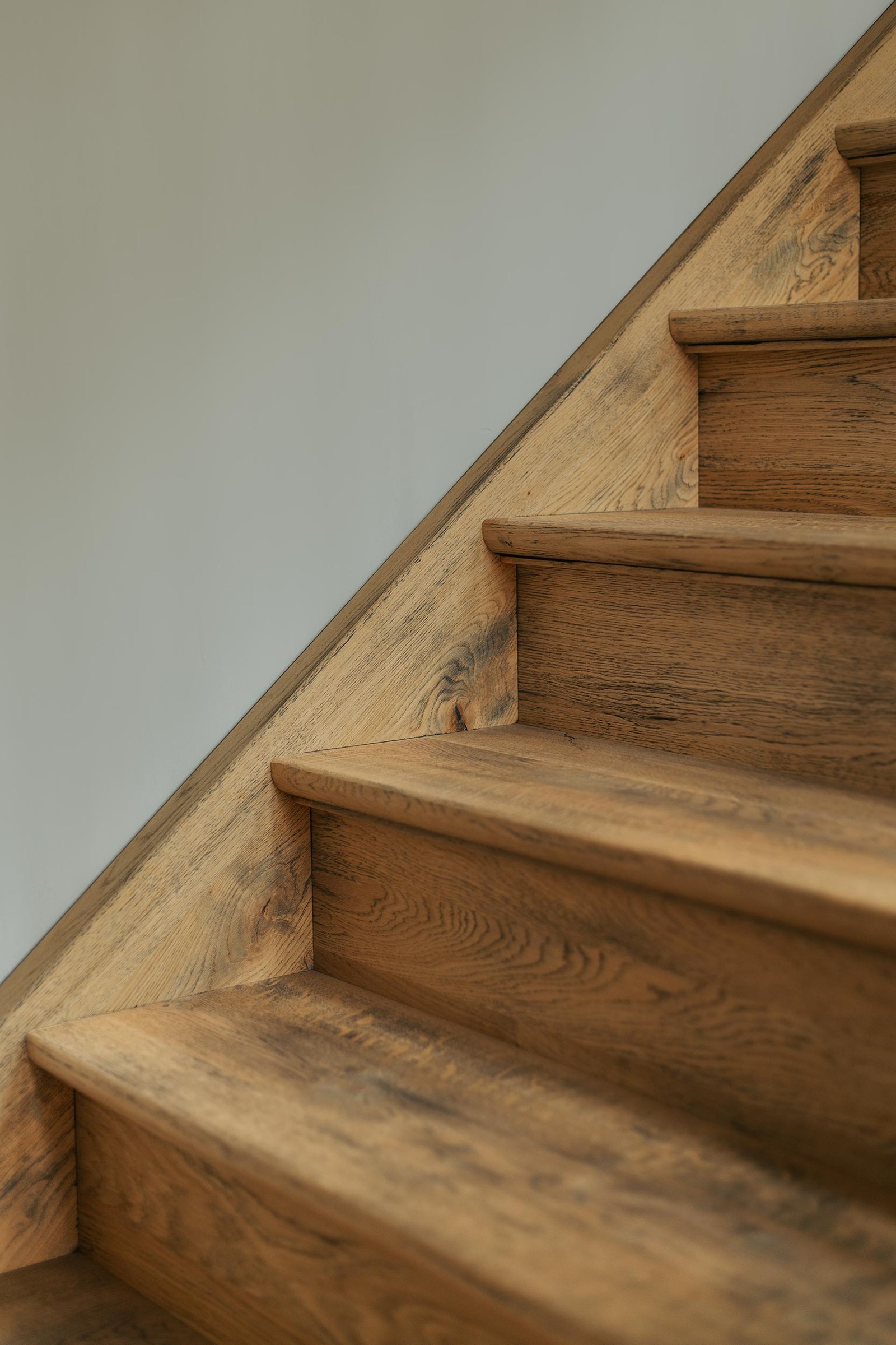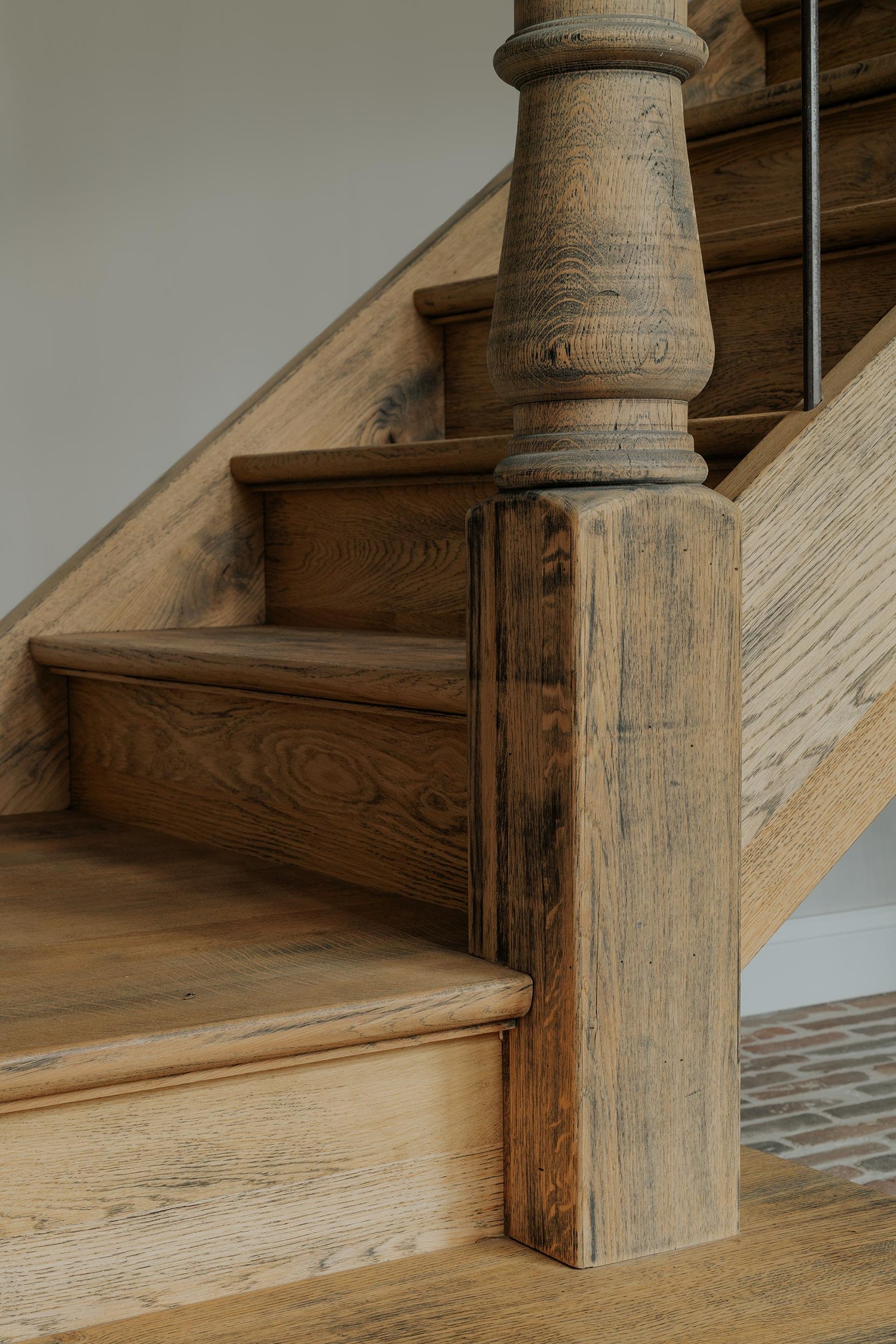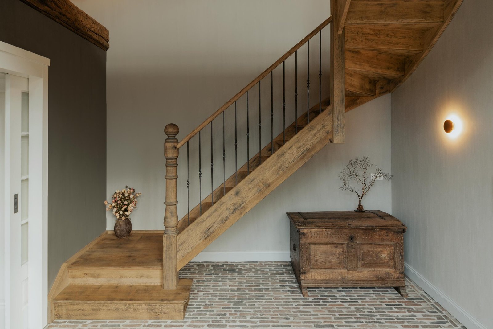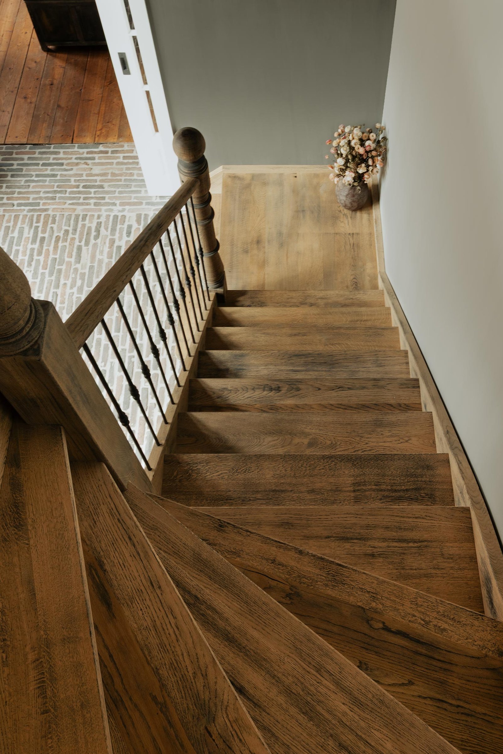 Deze robuuste eiken trap heeft een landelijke uitstraling en is voorzien van een bordes en bovenkwart. De treden zijn geprofileerd en geven de trap een klassiek en ambachtelijk karakter.
