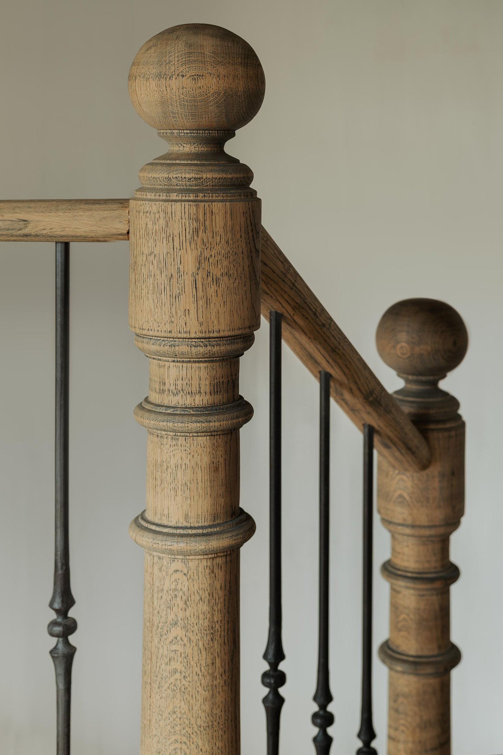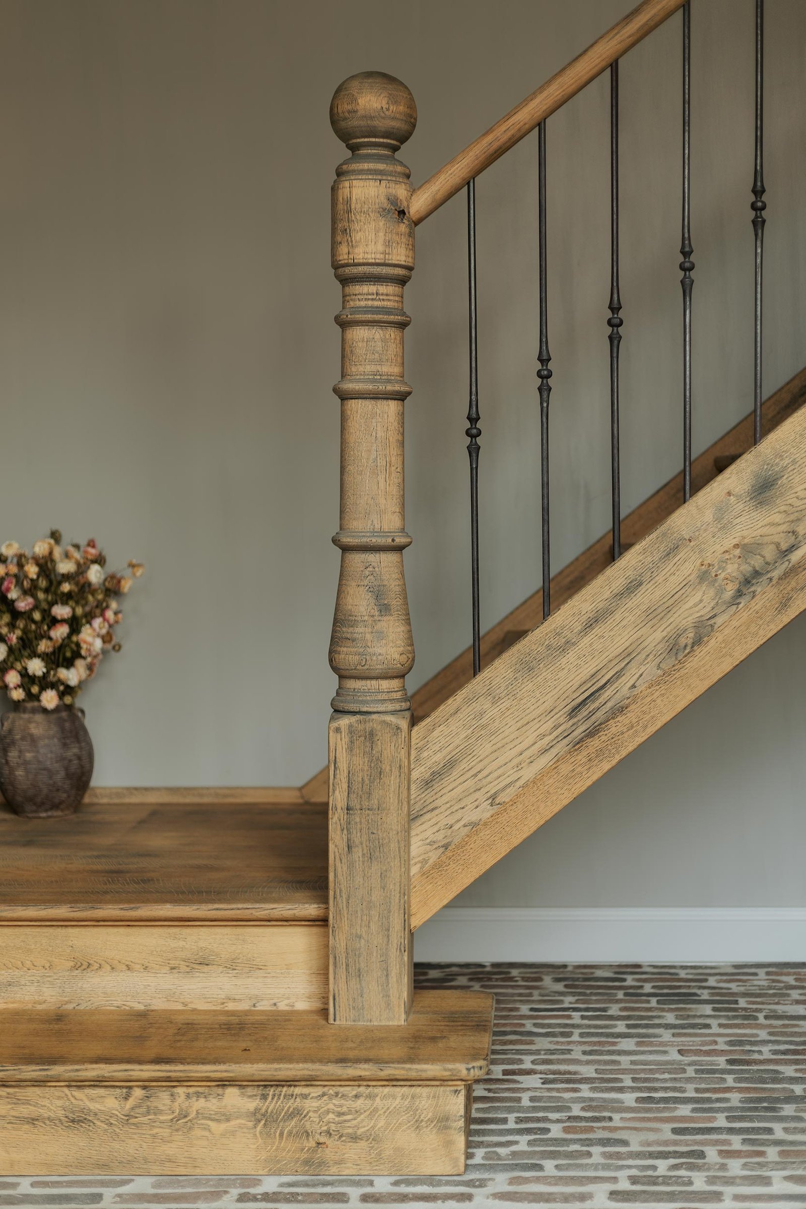 De combinatie van houten balustrades met smeedijzeren spijlen zorgt voor een stoere en authentieke look. Dankzij de speciale afwerking krijgt het hout een geleefde uitstraling, perfect voor een boerderij of landelijke woning.