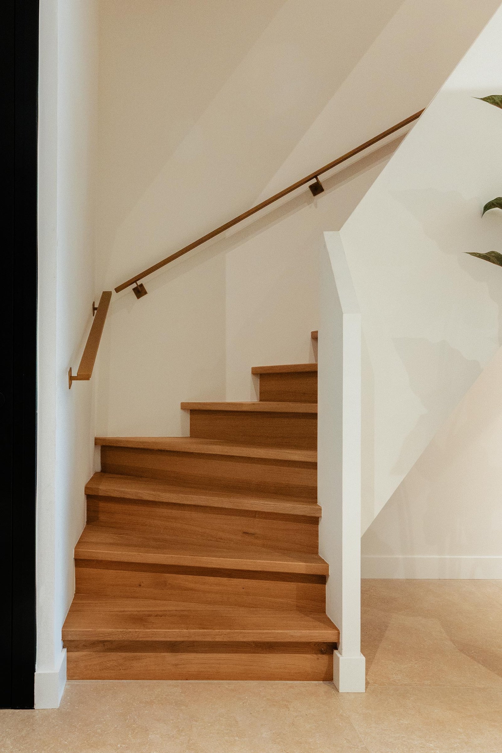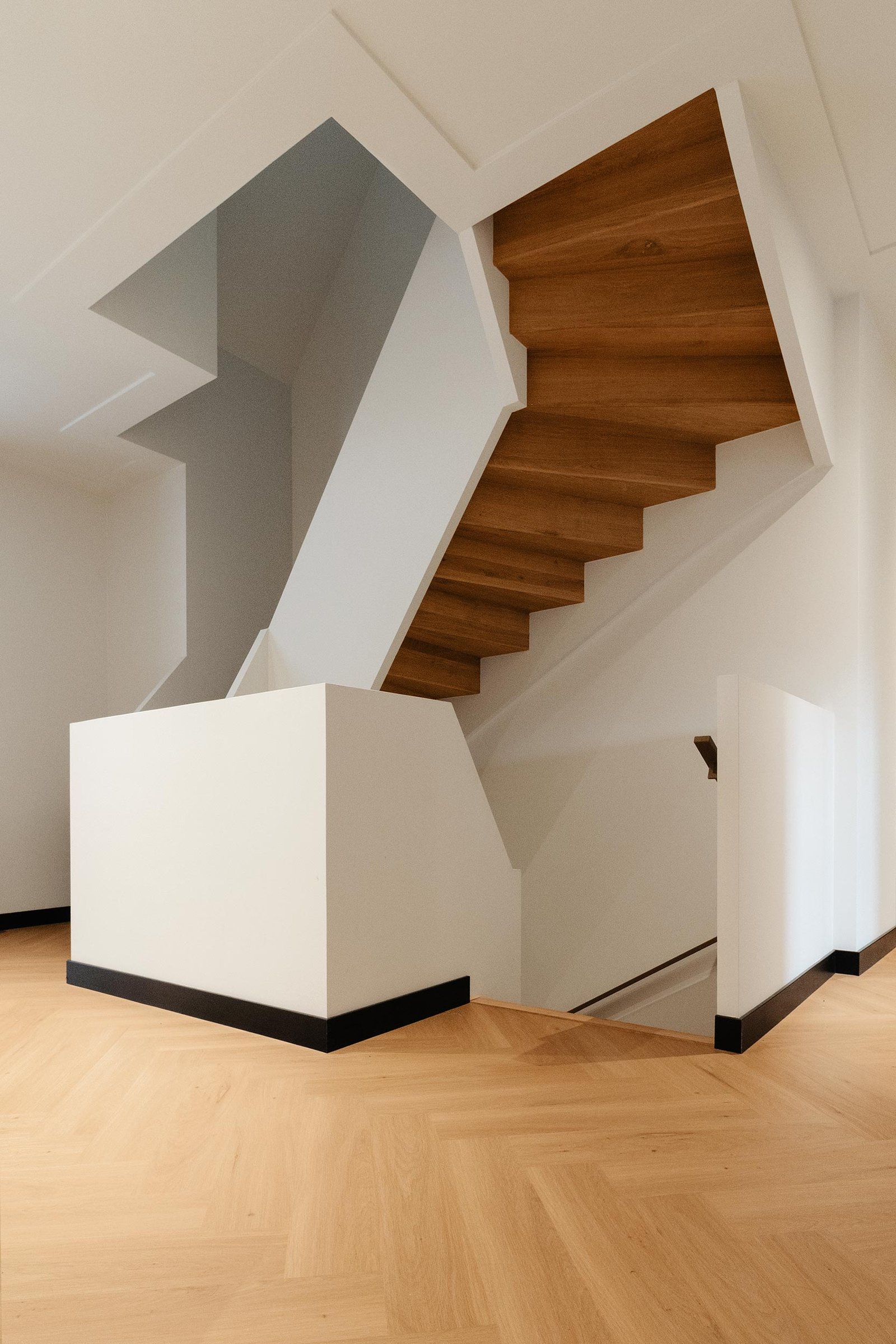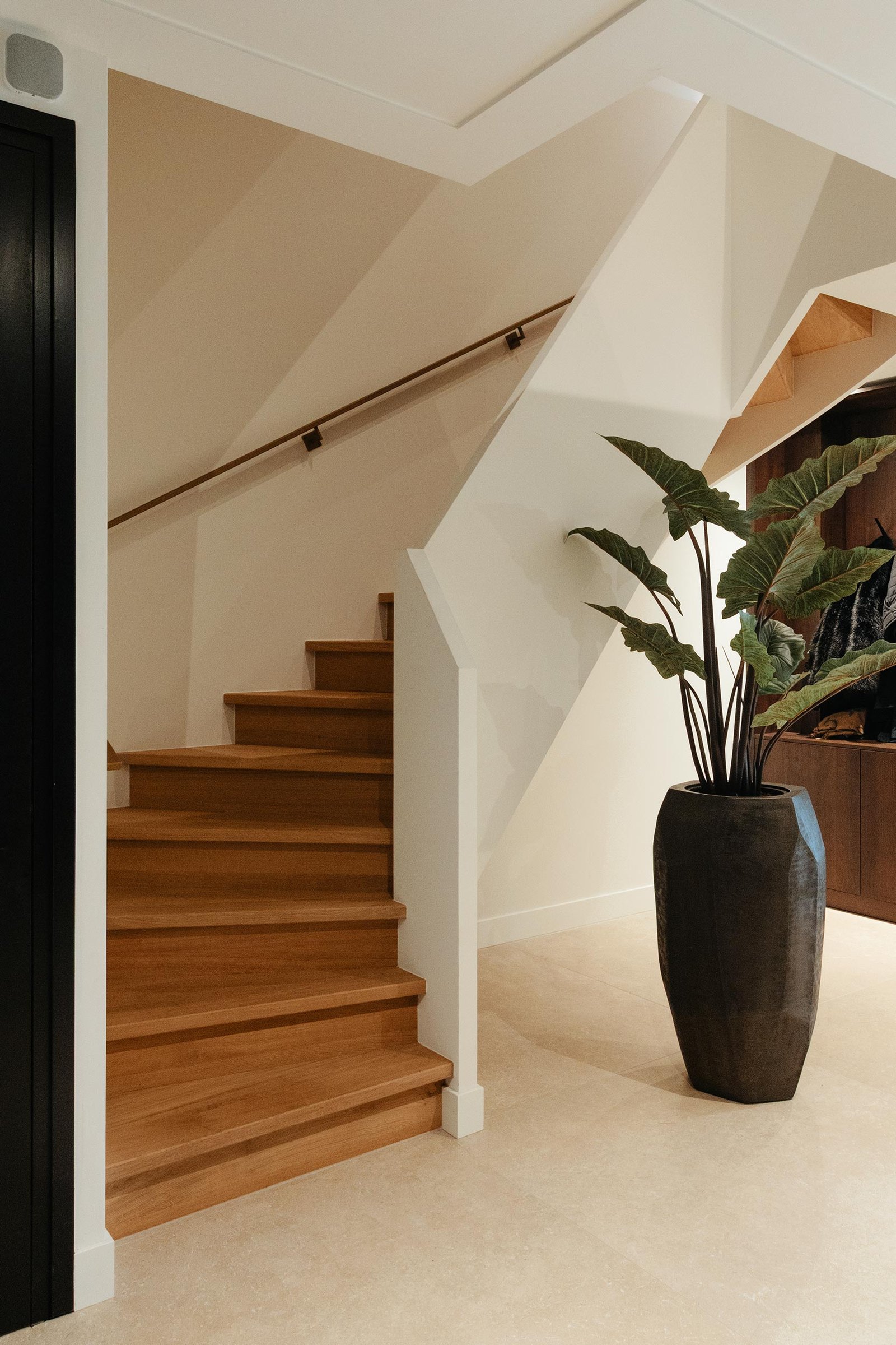 Deze moderne trap loopt elegant door van de begane grond tot aan de bovenverdieping en zolder en vormt één geheel met de ruimte. Het lijnenspel van de trap zorgt voor een speels en architectonisch effect, terwijl de eiken treden warmte toevoegen aan het interieur.