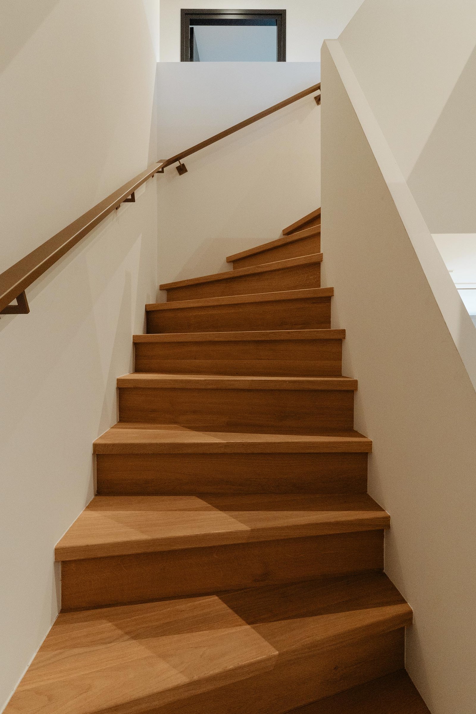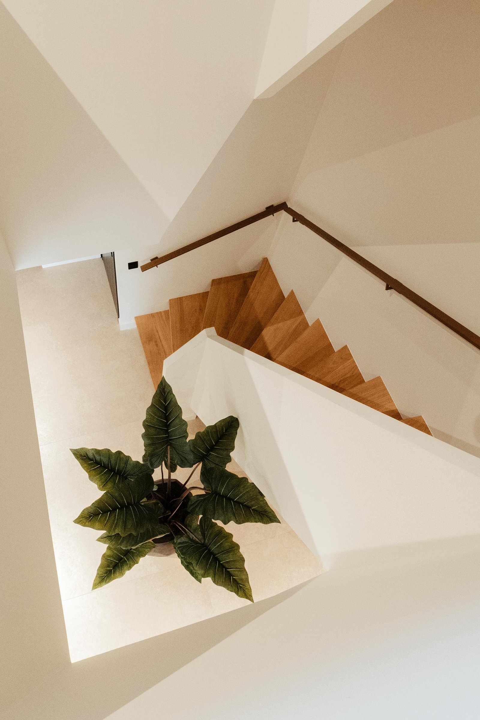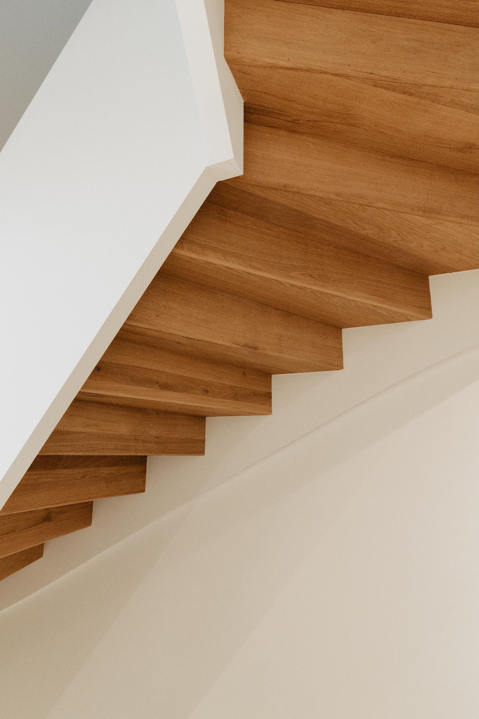 Deze moderne trap loopt elegant door van de begane grond tot aan de bovenverdieping en zolder en vormt één geheel met de ruimte. Het lijnenspel van de trap zorgt voor een speels en architectonisch effect, terwijl de eiken treden warmte toevoegen aan het interieur.