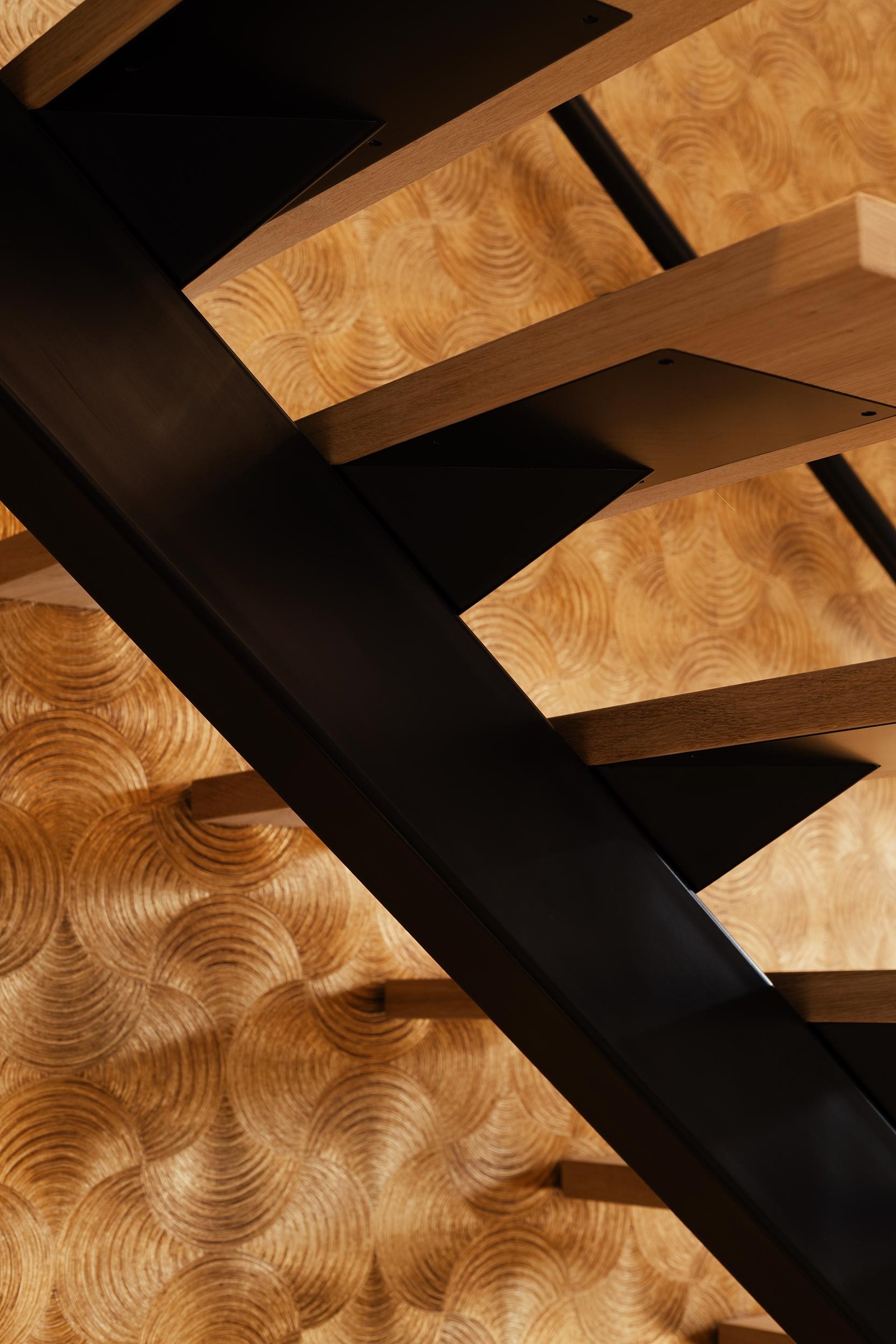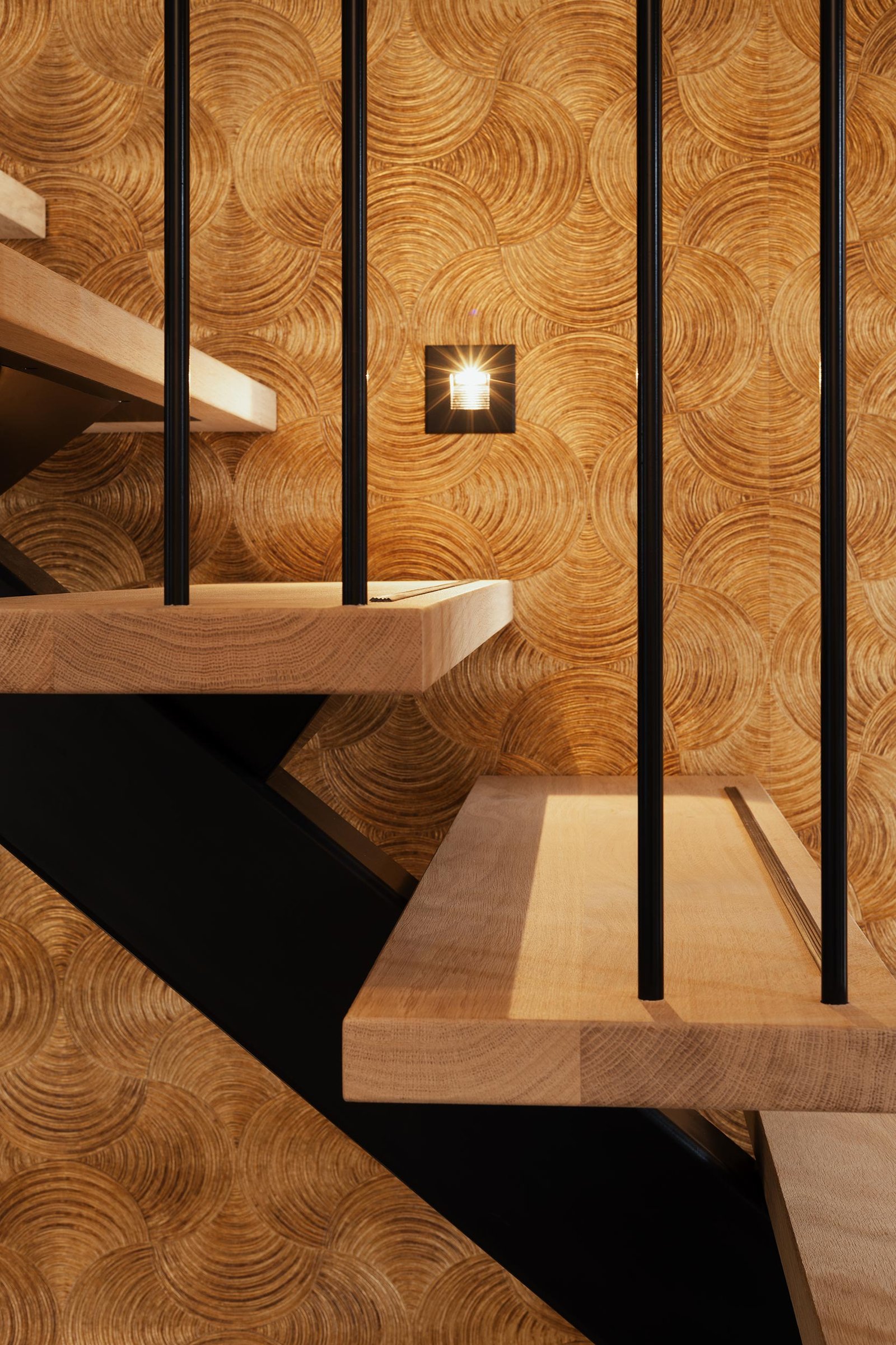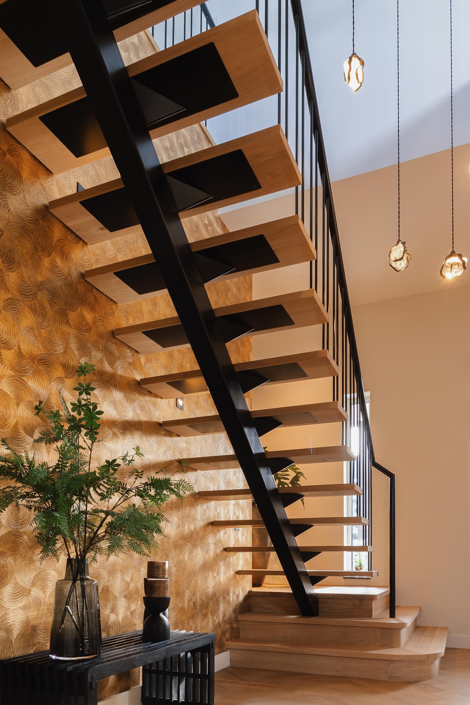 De eerste treden vormen een opvallend opstapbordes in piramidevorm, wat zorgt voor een unieke entree. Daarnaast is de trap voorzien van subtiele verlichting, wat niet alleen praktisch is maar ook sfeer geeft.