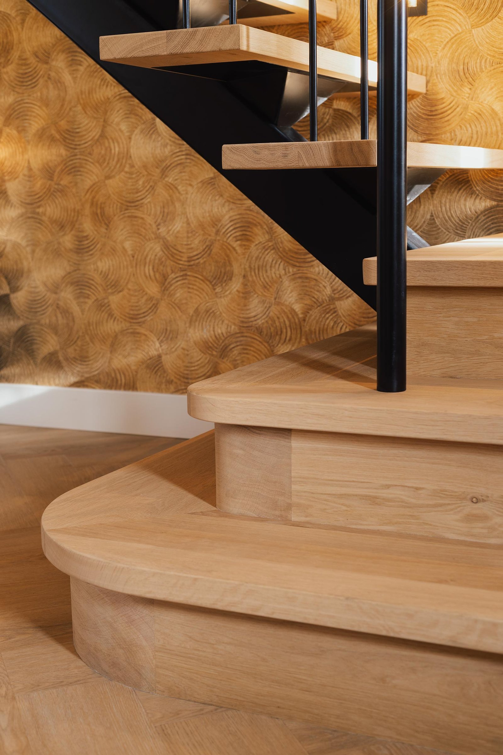 Deze trap heeft een krachtige uitstraling dankzij de stalen middenboom met zwarte afwerking. De eiken treden zorgen voor een mooi contrast en brengen warmte in het geheel.